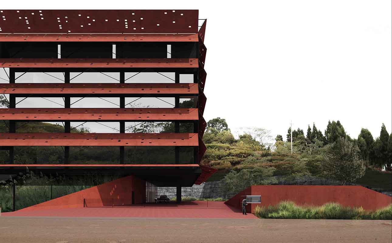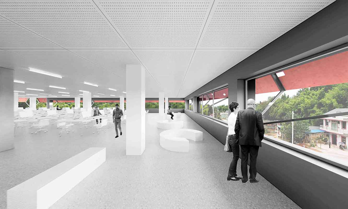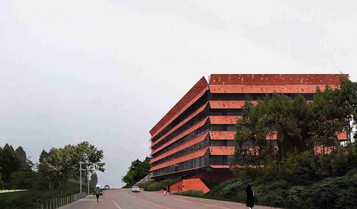 Prefabricated dyed concrete is chosen as the main material for exterior shading. The red color echoes the iconic red sandstone of Dazu and makes the building a prominent landmark along the highway. The light transmission holes on the sun visor are arranged according to the pig DNA sequence, making the building facade a drawing board to show the story of the enterprise, following the local tradition of Dazu Rock Carvings to visualize religious stories.